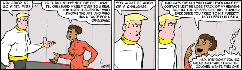 Doctor Bunnigus: Hah! Says the guy who can't even make eye contact lest he loose track of my heaving bosom. You've been getting stupider ever since you tried to hit puberty and puberty hit back.