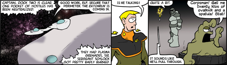 Schlock: Corpsman! Get me twenty kilos of Ovalkwik and a spatula! Stat!
