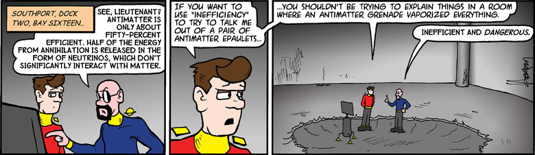 Kevyn: See, Lieutenant? Antimatter is only about fifty-percent efficient. Half of the energy from annihilation is released in the form of neutrinos, which don't significantly interact with matter.