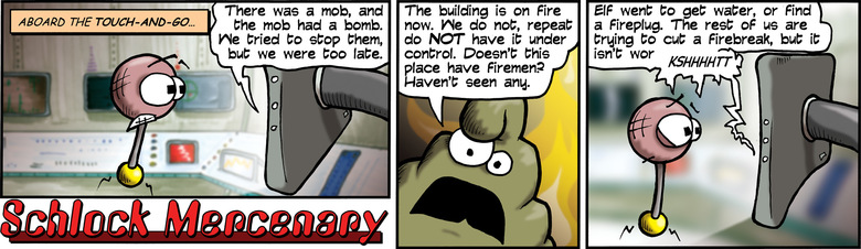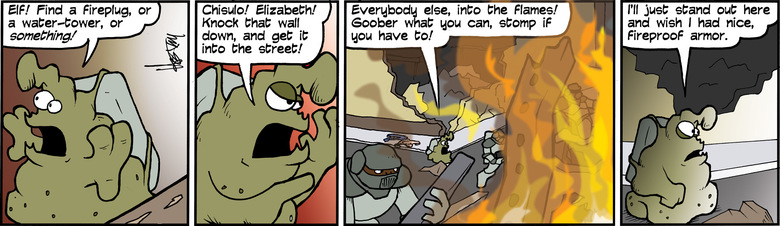 Schlock: Elf went to get water, or find a fireplug. The rest of us are trying to cut a firebreak but it isn't wor=
