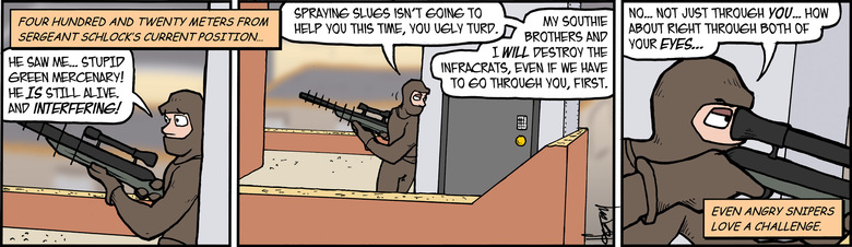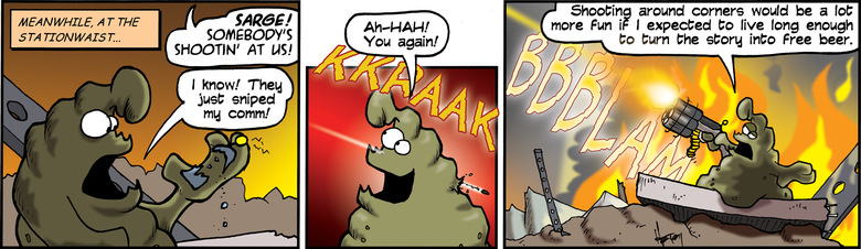 Schlock: Shooting around corners would be a lot more fun if I expected to live long enough to turn the story into free beer.