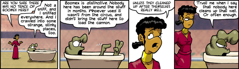 SCHLOCK: Boomex is distinctive. Nobody here has been around the stuff in months. Whoever used it wasn't from the circus, and didn't bring the stuff here to load the cannon.