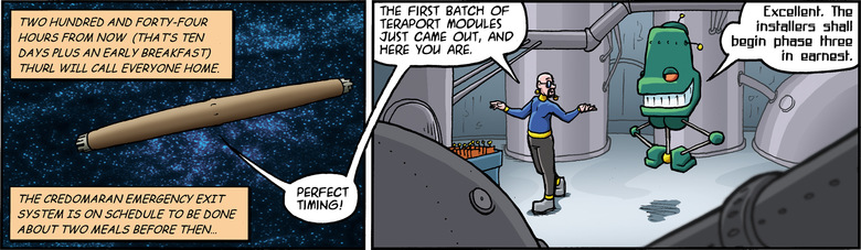 The Credomaran emergency exit system is on schedule to be done about two meals before then...