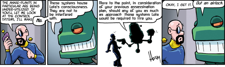 LOTA: More to the point, in consideration of your previous assassination plan, should any of you as much as approach those systems Lota would be required to fire you.