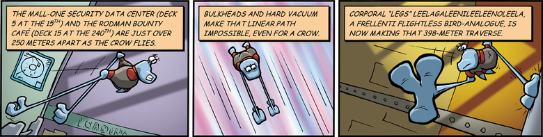 NARRATOR: Corporal "Legs" Leelagaleenileeleenoleela, a frellenti flightless bird-analogue, is now making that 398-meter traverse.