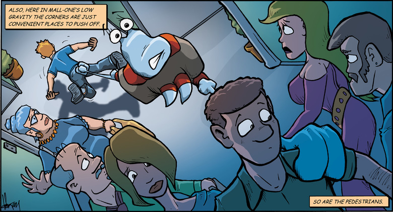 NARRATOR: Also, here in Mall-One's low gravity the corners are just convenient places to push off.