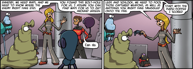 KATHRYN: Legs and Schlock, we need to pool those captured weapons, as well as anything you might have smuggled onto the hive.