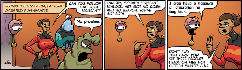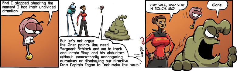 ENNESBY: But let's not argue the finer points. You need Sergeant Schlock and me to track and locate Shep and his abductors without unnecessarily endangering ourselves or disobeying our directive from Captain Tagon to "not make the news."