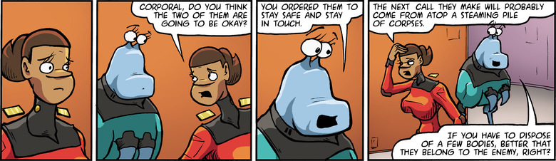 BUNNI: Ennesby, go with Sergeant Schlock. He's got no comm, and no weapon. You've got both.