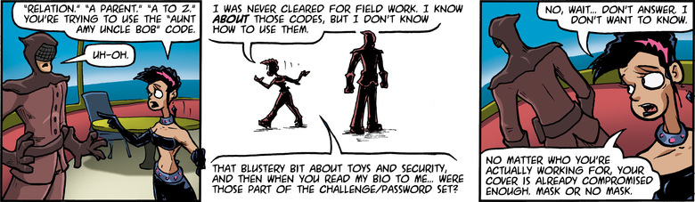 No matter who you're actually working for, your cover is already compromised enough. Mask or no mask.