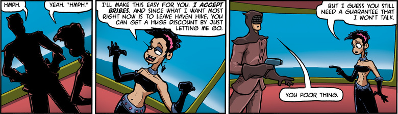 KATHRYN: I'll make this easy for you. I accept bribes. And since what I want most right now is to leave Haven Hive, you can get a huge discount by just letting me go.