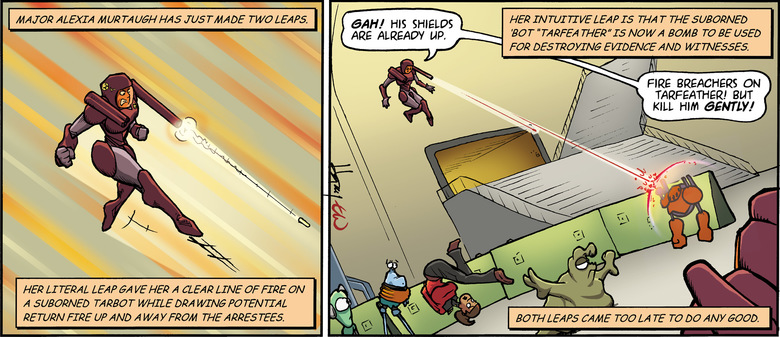 NARRATOR: Her literal leap gave her a clear line of fire on a suborned tarbot while drawing potential return fire up and away from the arrestees.