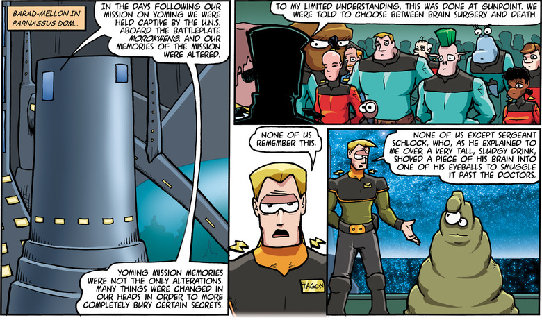 TAGON: None of us except Sergeant Schlock, who, as he explained to me over a very tall, sludgy drink, shoved a piece of his brain into one of his eyeballs to smuggle it past the doctors.