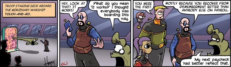 NARRATOR: Troop staging deck aboard the mercenary warship Touch-And-Go...