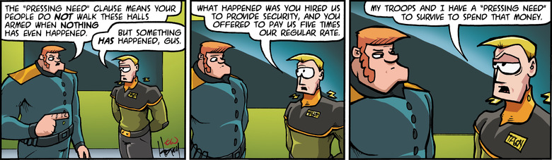 GUS: The "pressing need" clause means your people do not walk these halls armed when nothing has even happened.