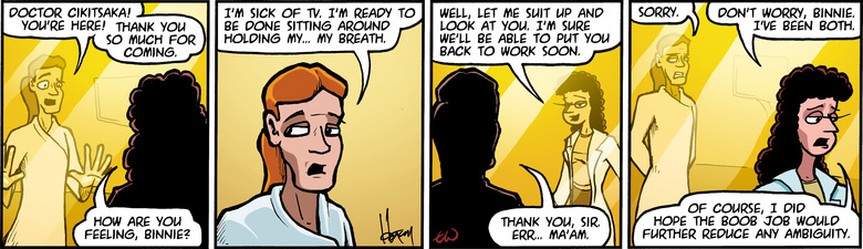 BINNIE: I've seen the vid. Waldork threw me clear across the bay. I bet the nannies are just finishing tissue repairs.