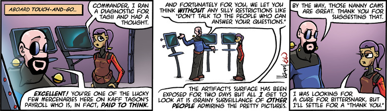 KEVYN: Excellent! You're one of the lucky few mercenaries here on Kaff Tagon's payroll who is, in fact, paid to think.