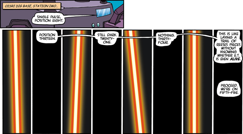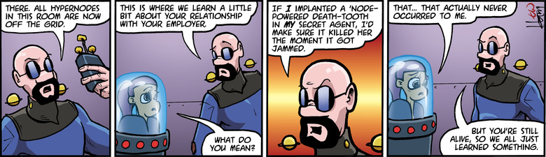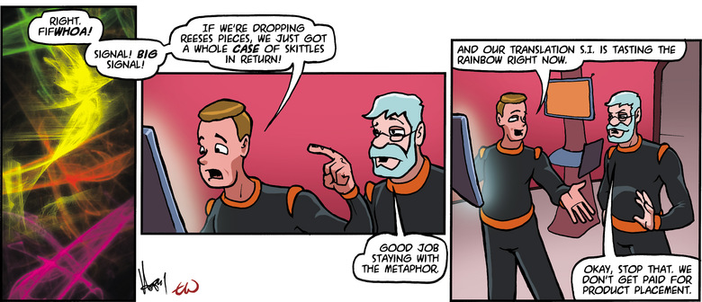 Note: Since there are likely some younger readers wondering what "E.T." is, there are no doubt older readers wondering how anybody would know about E.T. (let alone Skittles or "taste the rainbow") in the 31st century. By way of reminder, the two Gavcorps scientists in the above strip, Kevyn Dietz and Kent Rice, are transmogrified Gavs, and while they have full sets of fabricated memories and skills, they also retain their pre-freeze recollection of 20th and 21st century pop-culture: Skittles, E.T., Max Headroom, The Matrix, and a host of other long-forgottens.