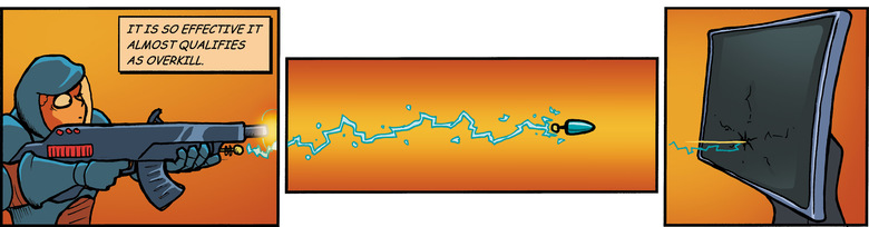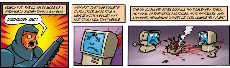 NARRATOR: The DD-101 pulser fires rounds that release a thick, hot hail of energetic particles, anti-particles, and shrapnel, rendering target devices completely inert.