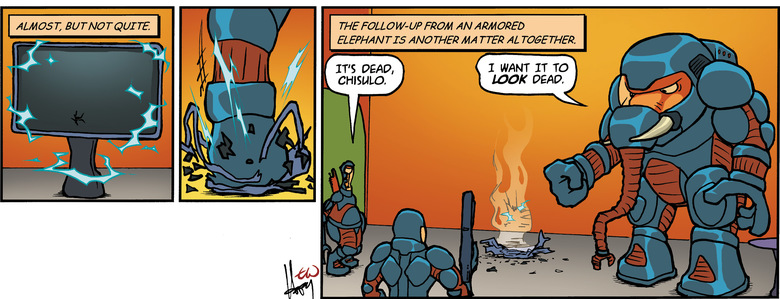 NARRATOR: The follow-up from an armored elephant is another matter altogether.