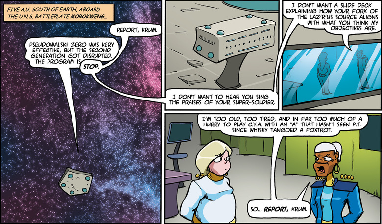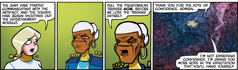 KRUM: The Gavs have started communicating with the artifact, and the Toughs have begun shooting out the entertainment modules.