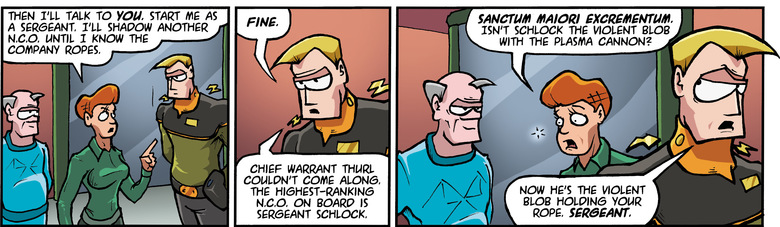 Chief Warrant Officer Thurl couldn't come along. The highest-ranking N.C.O. on board is Sergeant Schlock.