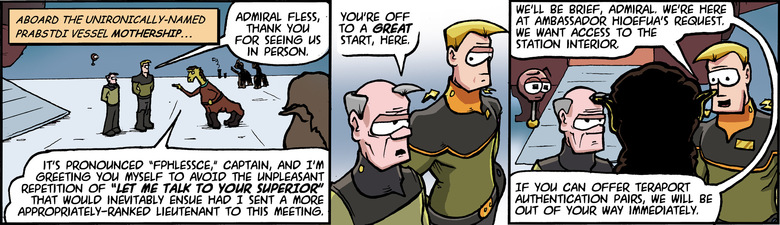 FPHLESSCE: It's pronounced "Fphlessce," Captain, and I'm greeting you myself to avoid the unpleasant repetition of "Let me talk to your superior" that would inevitably ensue had I sent a more appropriately-ranked lieutenant to this meeting.