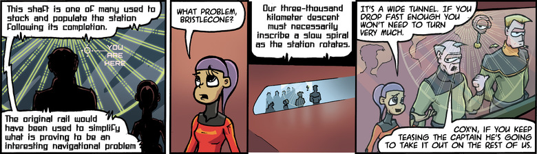 BRISTLECONE: Our three-thousand kilometer descent must necessarily inscribe a slow spiral as the station rotates.