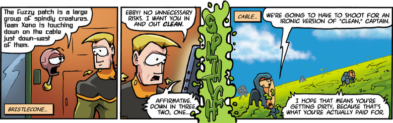 ENNESBY: The fuzzy patch is a large group of spindly creatures. Team Xeno is touching down on the cable just down-west of them.