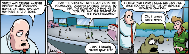 Had the Sergeant not leapt onto the Promenade, drawing Officer Tragun to him, the bomb would have killed you, me, and the Speaker of the Proletariament.