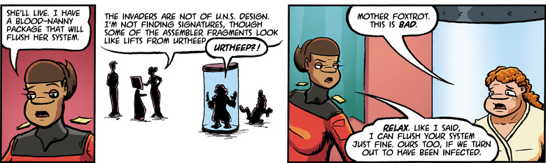 BUNNI: The invaders are not of U.N.S. design. I'm not finding signatures, though some of the assembler fragments look like lifts from Urtheep—
