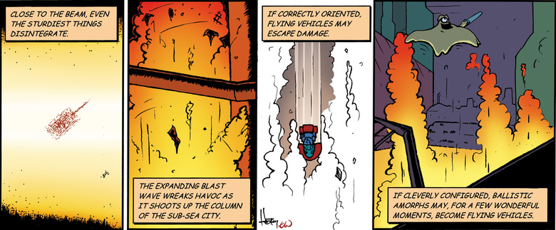 The expanding blast wave wreaks havoc as it shoots up the column of the sub-sea city.