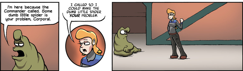 SCHLOCK: I'm here because the Commander called. Some dumb little spider is your problem, Corporal.