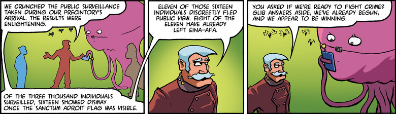 Of the three thousand individuals surveilled, sixteen showed dismay once the Sanctum Adroit flag was visible.