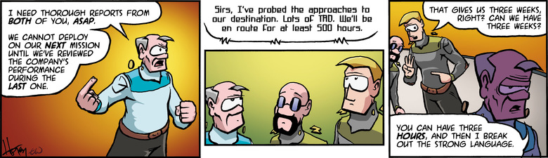 We cannot deploy on our next mission until we've reviewed the company's performance during the last one.
