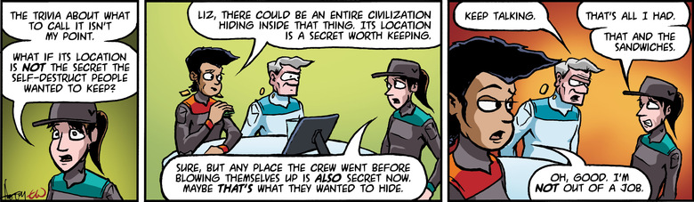 LIZ: Sure, but any place the crew went before blowing themselves up is also secret now. Maybe that's what they wanted to hide.