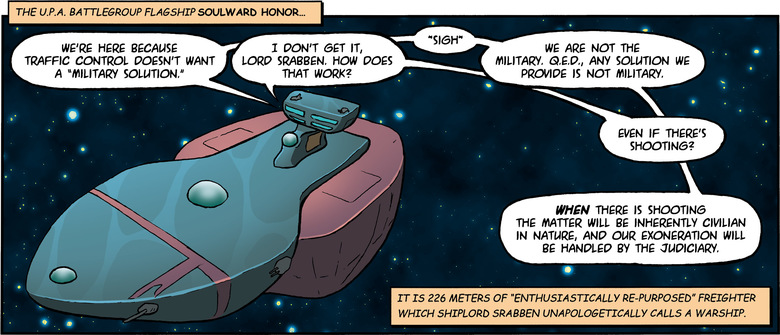 NARRATOR: It is 226 meters of "enthusiastically re-purposed" freighter which Shiplord Srabben unapologetically calls a warship.