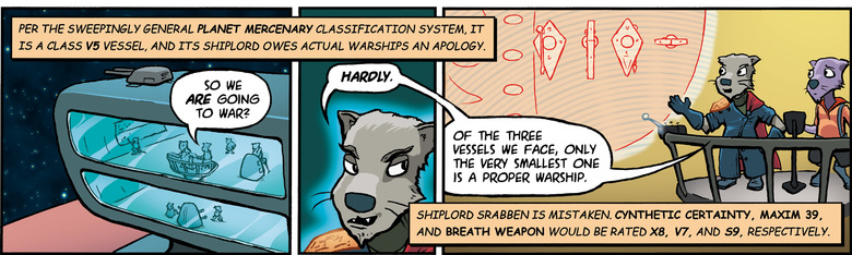 NARRATOR: Shiplord Srabben is mistaken. Cynthetic Certainty, Maxim 39, and Breath Weapon would be rated X8, V7, and S9, respectively.