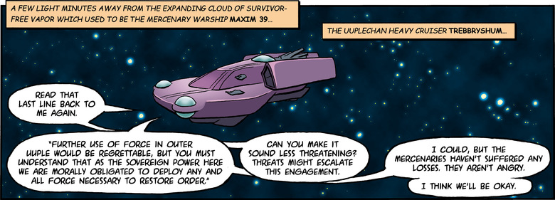 NARRATOR: A few light minutes away from the expanding cloud of survivor-free vapor which used to be the mercenary warship Maxim 39...